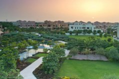 - Вид на пышные зеленые сады, озера и панораму Дубая