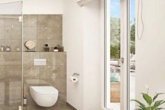 - Просторные современные ванные комнаты (отделка керамогранитом, душевые кабины в уровень с полом, дизайнерская арматура)