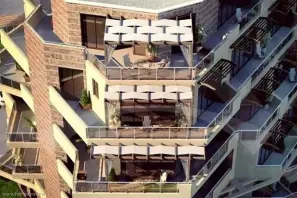 Здание Миллениум построено на большом расстоянии от соседних домов, что создает ощущение уединенности и неограниченного простора. Фасады здания облицованы природным камнем - травертином. Это очень прочный материал, который использовался при строительстве знаменитого Колизея и Собора святого Петра. Многие квартиры с большими террасами и красивым видом на море, оснащены легкими и изящными перголами, которые создают романтическую атмосферу и защищают от палящего солнца. Большинство квартир с двумя спальнями позволяют любоваться не только фантастическим видом на море, но и горным пейзажем.