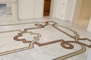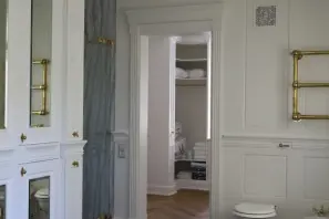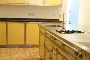 Столовая. Помещение с уникальным паркетом, потолками с лепниной и панелями на стенах из обработанного дерева расположено на первом этаже. Здесь же оборудована кухня, в которой установлена техника ведущего французского бренда La Cornue, широко известного своей ручной работой и безупречным дизайном.