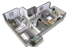 Квартира состоит из гостиной совмещеной с кухней, двух спальных комнат, ванной комнаты, санузла, коридора и двух балконов.
