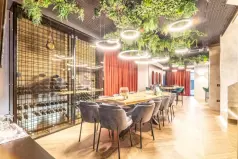 Построен на 3 этажах, соединенных между собой внутренней лестницей и лифтом. Цокольный этаж: место для общения с выходом на просторную террасу с джакузи, санузлом, сауной и подсобным помещением. Первый этаж: гостиная, кухня и столовая открытого плана, гардеробная. Первый этаж: коридор, две спальни с санузлами, главная спальня с санузлом и гардеробной, лоджия 9,10 м2. Имеется двор с крытой парковкой на две машины. Общая расчетная НКП 245,90 м2.