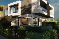 На первом этаже кухня со столовой и гостиной, кладовая и гардероб, а также туалет. Первый этаж ведет на террасу с бассейном, солярием, уличным туалетом, перголой и ландшафтным садом.