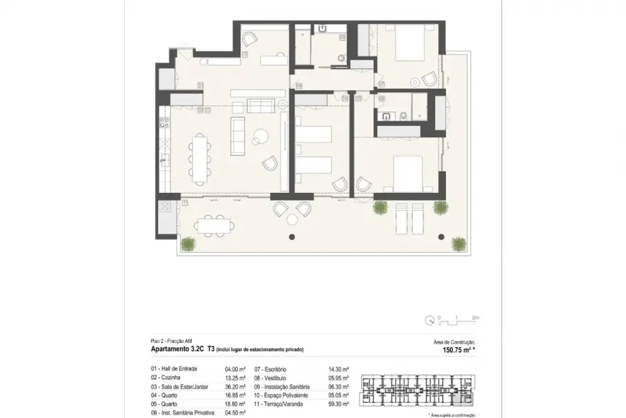 Современные апартаменты с 3 спальнями, жилой площадью 150 м2 и терассой 59 м2, дополненные 2 парковочными местами.