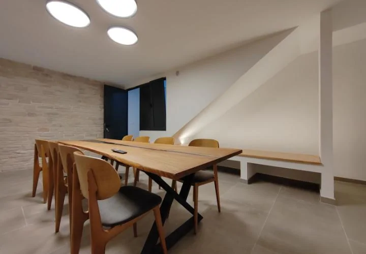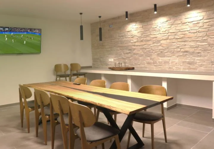 Подвал площадью 35 м^2 создан для общественных мероприятий и располагает винным погребом, уникальным дубовым столом, баром и зимней кухней — идеальное место для семейных посиделок, дегустаций вин или уютных вечеров в прохладные месяцы.