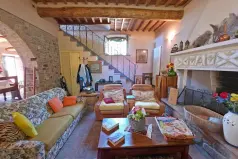 Layout: Approx. 250 m² large platform – terrace. To the left is a small stone cottage for storage. Next to it is a wood-burning stove attached to the house. Front entrance to the house – the lower area is completely open, decorated throughout with wooden beams and round arches. Large open kitchen with fireplace, WC and pantry, room, large dining room (additional door to the terrace) and TV/fireplace room with fireplace. Stairs to the first floor. Here there is also an exit to the garden. Storage space in the stairwell.