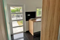 Рядом с кухней находится ванная комната, а также прямой выход на террасу, где есть место для отдыха: бассейн и крытая гостиная с барбекю, идеально подходящая для летних посиделок, семейных обедов или тихих вечеров с видом на природу.