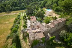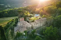 Расположенный в уединённой долине, у подножия величественной крепости Рокка-ди-Пьерле, находится борго древнейшего происхождения, который уже с XVIII века служил приютом и местом отдыха для путников, следовавших по долине.Весь комплекс общей площадью около 2 200 кв. м, частично отреставрированный и частично требующий восстановления, включает господскую виллу, старинную табачную сушильню (tabaccaia), сельский дом и несколько полуразрушенных строений.Пройдя через вход в борго, мы попадаем к главной вилле, состоящей из трёх уровней.На первом этаже расположены кухня, гостиная, украшенная старинным каменным камином, а также различные вспомогательные помещения; на втором и третьем этажах находится просторная спальная зона и два мансардных помещения.В прилегающих к жилой части объёмах, которые ещё предстоит переосмыслить, открывается возможность создания эксклюзивных сьютов с собственными ванными комнатами либо отдельных апартаментов для гостей площадью от 80 до 150 кв. м — идеальных для создания туристического уровня высокого уровня.Старинная табачная сушильня, в свою очередь, была тщательно отреставрирована с вниманием к аутентичному стилю и в настоящее время включает три элегантных апартамента, каждый из которых оснащён гостиной с камином, кухонным уголком и двумя просторными семейными спальнями.В уединённом месте, вдоль одной из внутренних улиц борго, расположен сельский дом площадью около 300 кв. м, полностью требующий реконструкции. Это здание представляет собой уникальную возможность для создания второго панорамного бассейна либо новой велнес-зоны, погружённой в абсолютную тишину.Кроме того, на территории имеются руины и полуразрушенный сельский дом, расположенные соответственно к востоку и к северо-западу от борго.Завершают ансамбль впечатляющий инфинити-бассейн размером 6x12 м и участок около 42 га — подлинное "сельское королевство", включающее виноградники, оливковые рощи и вековые леса.