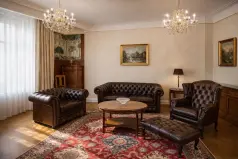 Аутентичные элементы интерьера — витражи, паркет и старинные деревянные панели — были бережно сохранены и отреставрированы при взаимодействии с органами охраны культурного наследия. Квартира с четырьмя комнатами находится на первом жилом уровне (над цокольным этажом) и доступна с помощью лифта.