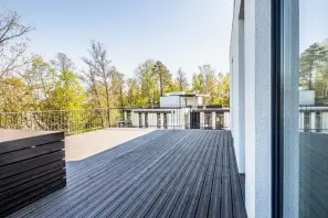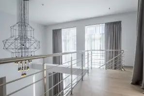Планировка: холл/прихожая с гардеробной и гостевым WC, отдельная просторная обеденная зона с оборудованной кухней, просторная гостиная с выходом на террасу на первом уровне и на террасу на крыше, на втором уровне - мастер-спальня с ванной комнатой и собственным выходом на террасу на крыше, дополнительно 2 спальни на первом уровне с выходом на террасу и ванная комната.