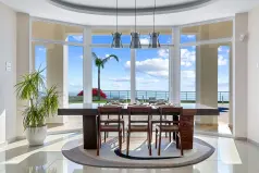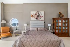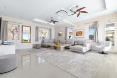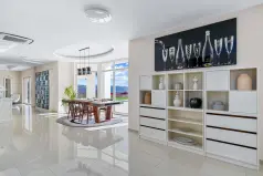 Все зоны и комнаты в особняке залиты естественным светом из больших окон и дверей с жалюзи, а цветовая гамма во всей резиденции яркая и теплая, в нежных нейтральных оттенках песка и бежевого, создающих успокаивающую элегантность интерьера.