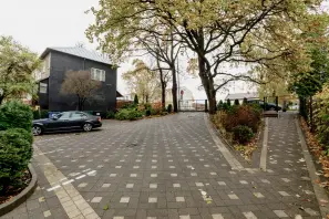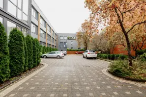 Закрытая и благоустроенная территория вокруг здания, вход с обеих улиц Вайрога и Раунас;