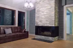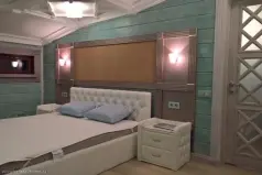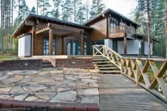 В главном здании пять спален, одна из которых с лофтом (двухуровневая), просторная гостиная с камином и огромными окнами в пол, полностью оборудованная кухня, столовая, электрическая вместительная сауна, хозяйственные помещения, санузлы на обоих этажах, балкон и терраса.